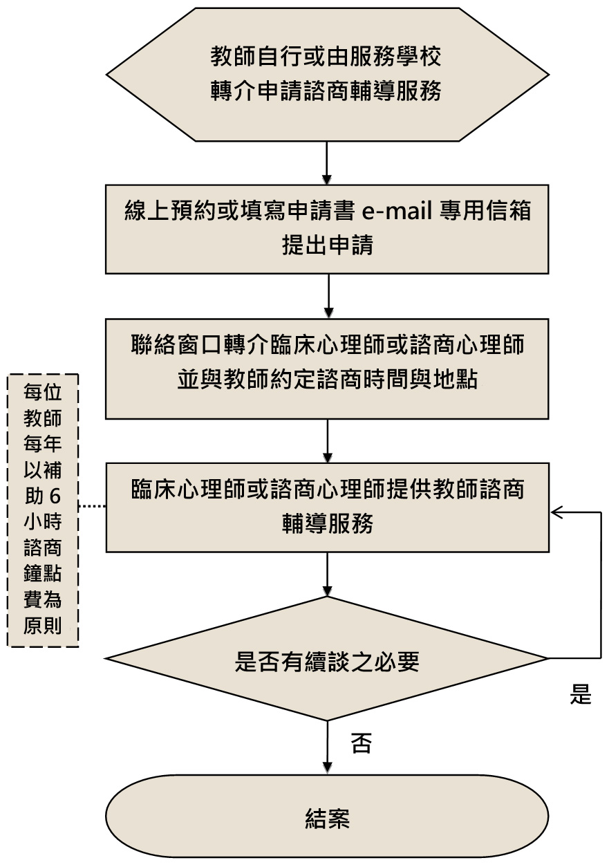 - 由教師自行或經教師同意後由學校轉介提出申請,線上預約或填寫申請書e-mail專用信箱提出申請,由受託單位專線負責人員受理協助媒合臨床心理師或諮商心理師與教師進行諮商會談。