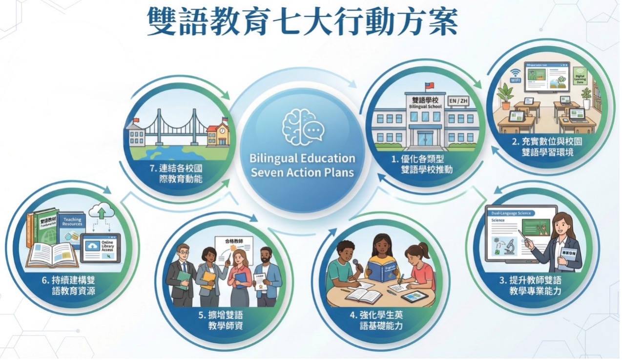 包括:優化各類型雙語學校推動、充實數位與校園雙語學習環境、提升教師雙語教學專業能力、強化學生英語基礎能力、擴增雙語教學師資、持續建構雙語教育資源,以及連結各校國際教育動能。透過雙語暨英語教育資源中心統籌規劃,辦理教師增能研習、雙語教學社群、入校協作與公開觀議課,協助學校發展符合課綱精神且兼顧在地特色的雙語課程。