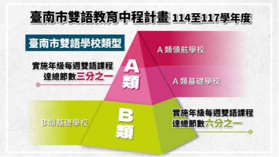臺南市配合國家2030雙語政策,自114學年度起推動雙語教育第二期中程計畫,進入「扎根厚實期」。在前一階段全面推動的基礎上,進一步強化雙語教學品質與系統化支持機制,全市國民中小學皆已納入雙語教育推動體系,並透過分級推動與專業陪伴,穩定深化校校雙語的實施成效。