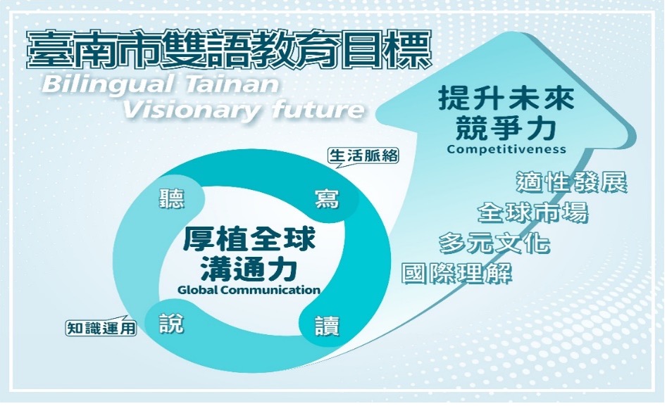 自2019年教育局以「扎根基礎,迎向未來:點亮孩子心中希望」為願景,聚焦在「扎根基本學力、美學創思力、問題解決力、智慧科技力及全球溝通力」五大發展方向,同時配合行政院2030年雙語國家政策,本市更自2020年起在既有基礎上進一步擘劃國民中小學雙語學校計畫,啟動各項加強英語能力計畫,期能深化學生以英語為工具,涵養多元文化與國際理解的溝通能力,逐步打造本市成為具有跨國競合力之雙語城市。